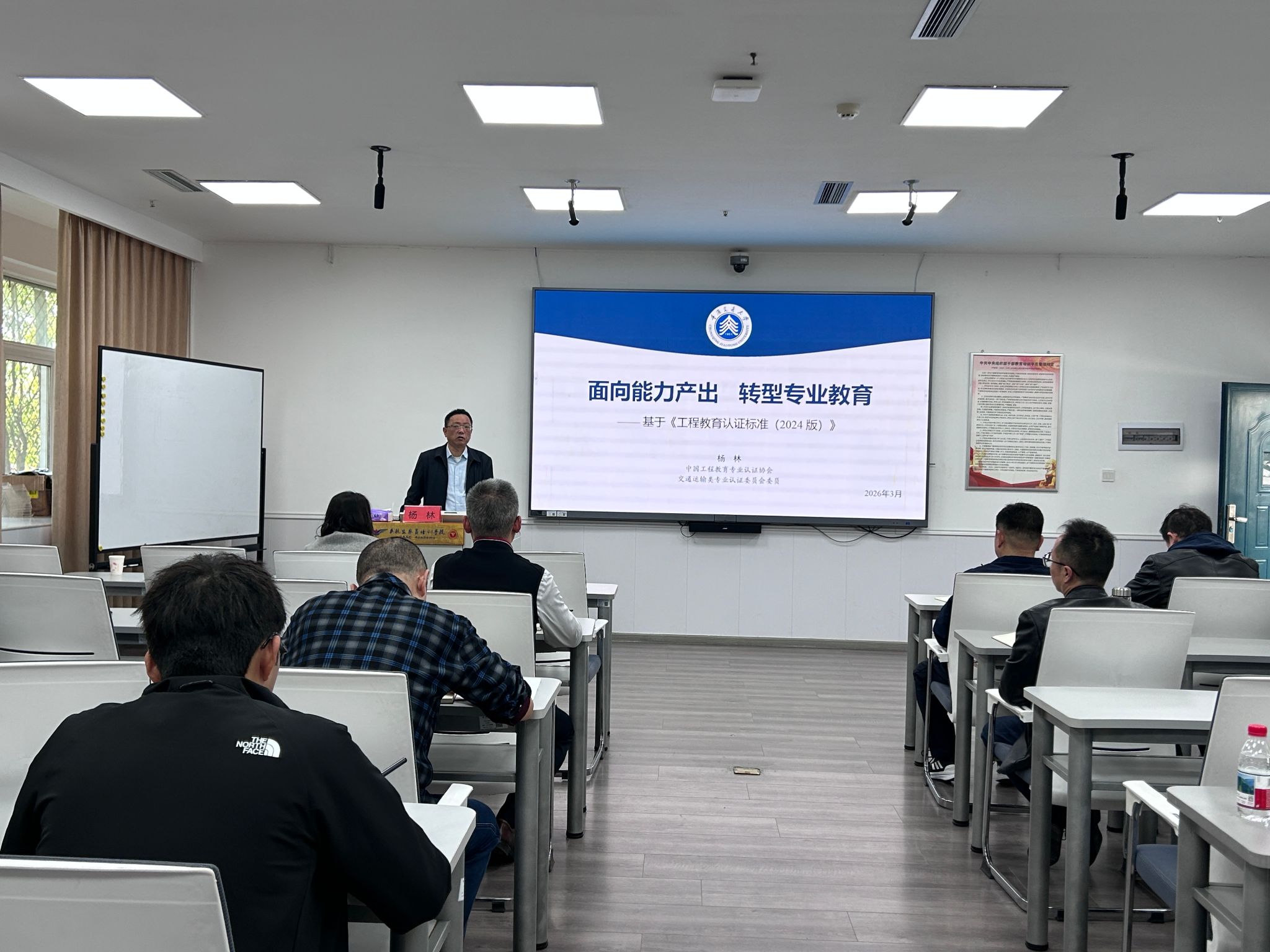 本网讯 陈惊宇 报道:开学伊始,为持续推进工程教育认证,深入贯彻《工程教育认证标准(2024 版)》要求,推动专业教育向能力产出导向转型,2026年3月11日,机场学院邀请中国工程教育专业认证专家、重庆交通大学杨林教授开展学术交流,会上机场学院院长程小慷对杨教授长期以来对我院学科专业建设的大力支持表示感谢,希望在交通工程专业建设持续改进中加强指导、合作。随后杨教授对我院交通工程、交通管理、物流工程三个本科专业的培养方案按照产出导向教育(OBE)的核心理念与实践路径,与专业教师进行深入讨论,提出修订意见。